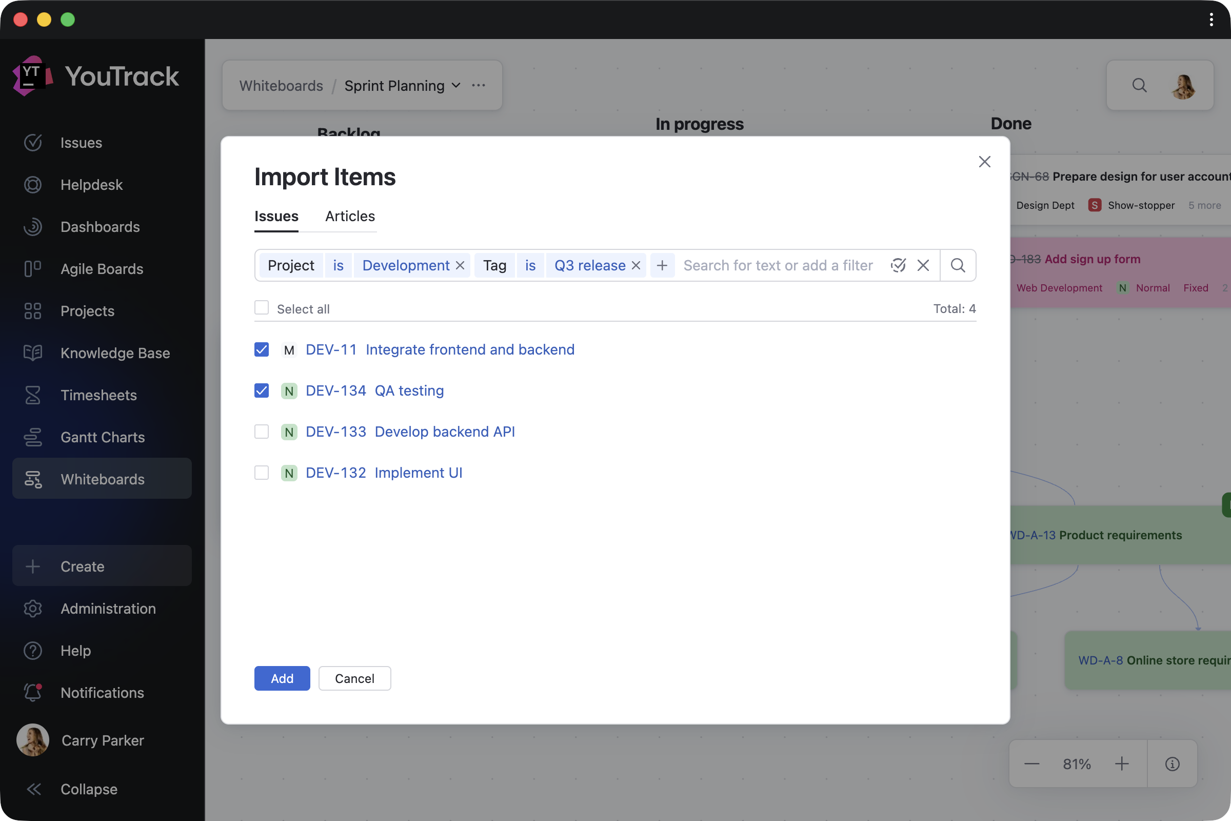 When you need to reorganize your current work, you can bring existing tasks, tickets, and articles onto your Whiteboard and update them directly as your plans evolve. Every change you make is instantly reflected across your projects – for both imported items and those created on the Whiteboard. Task dependencies are synced automatically as well.