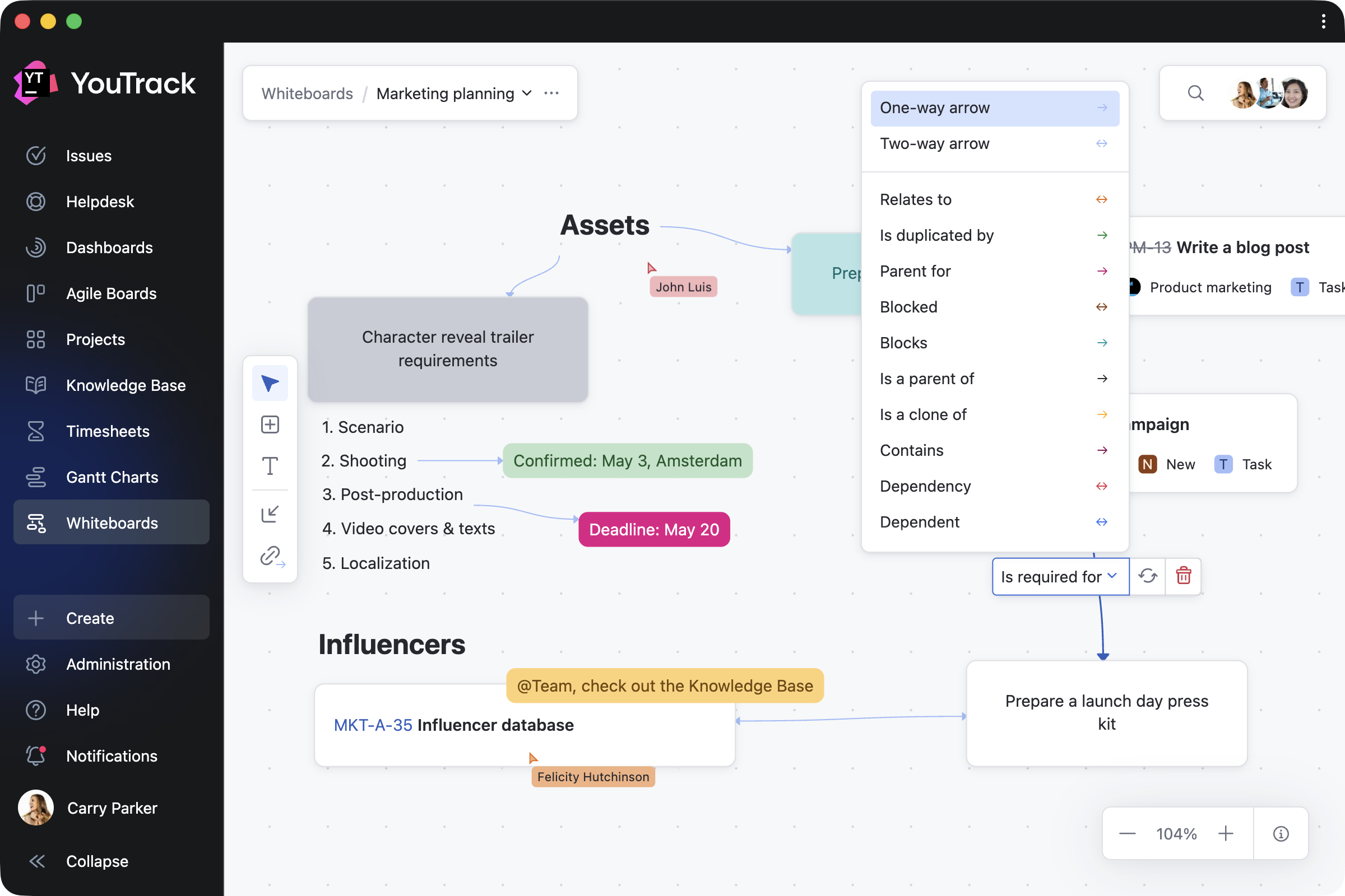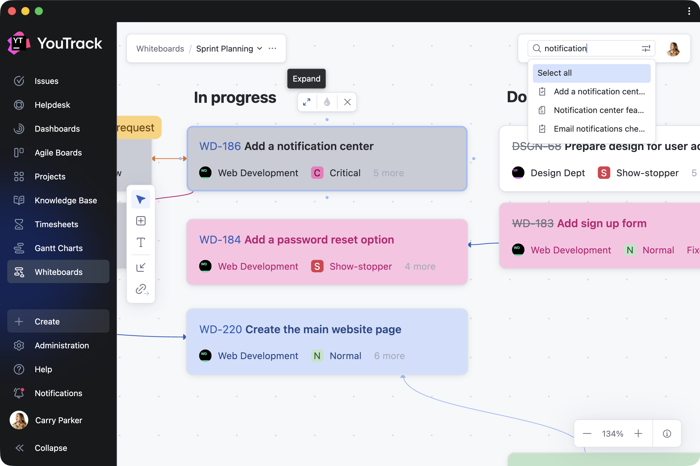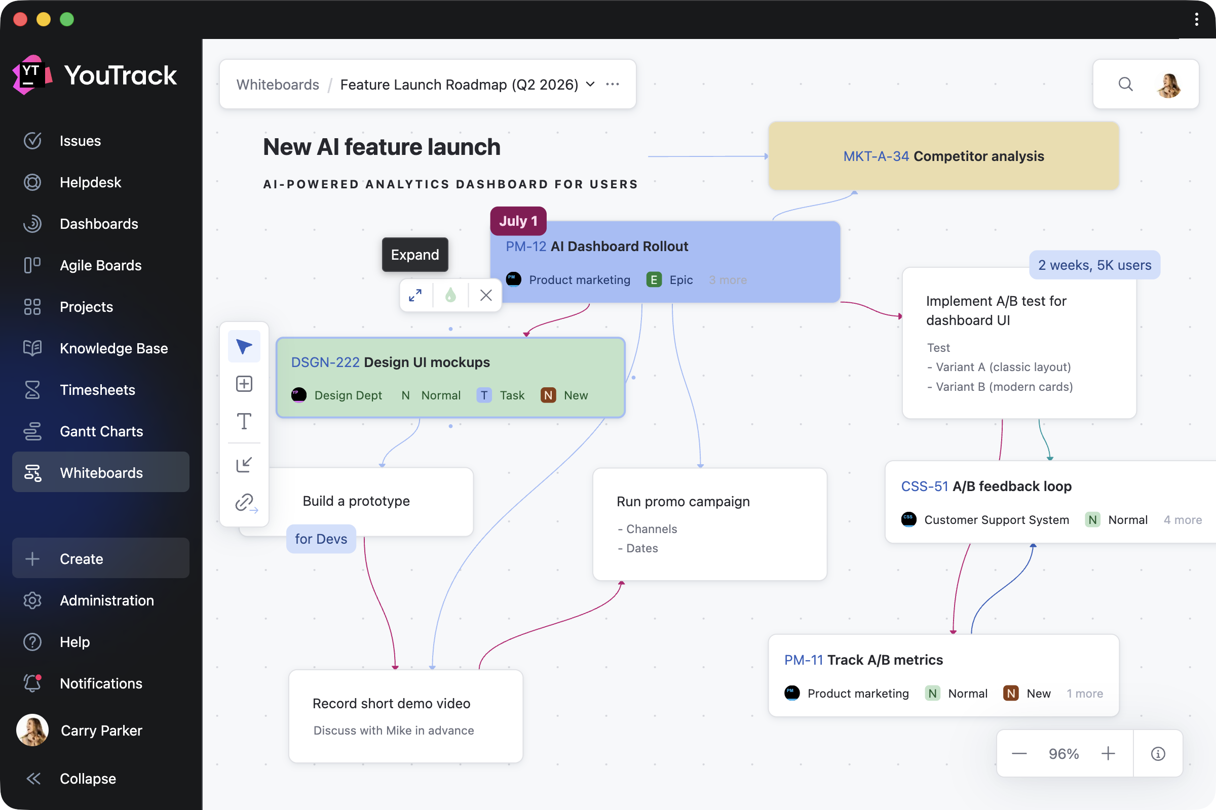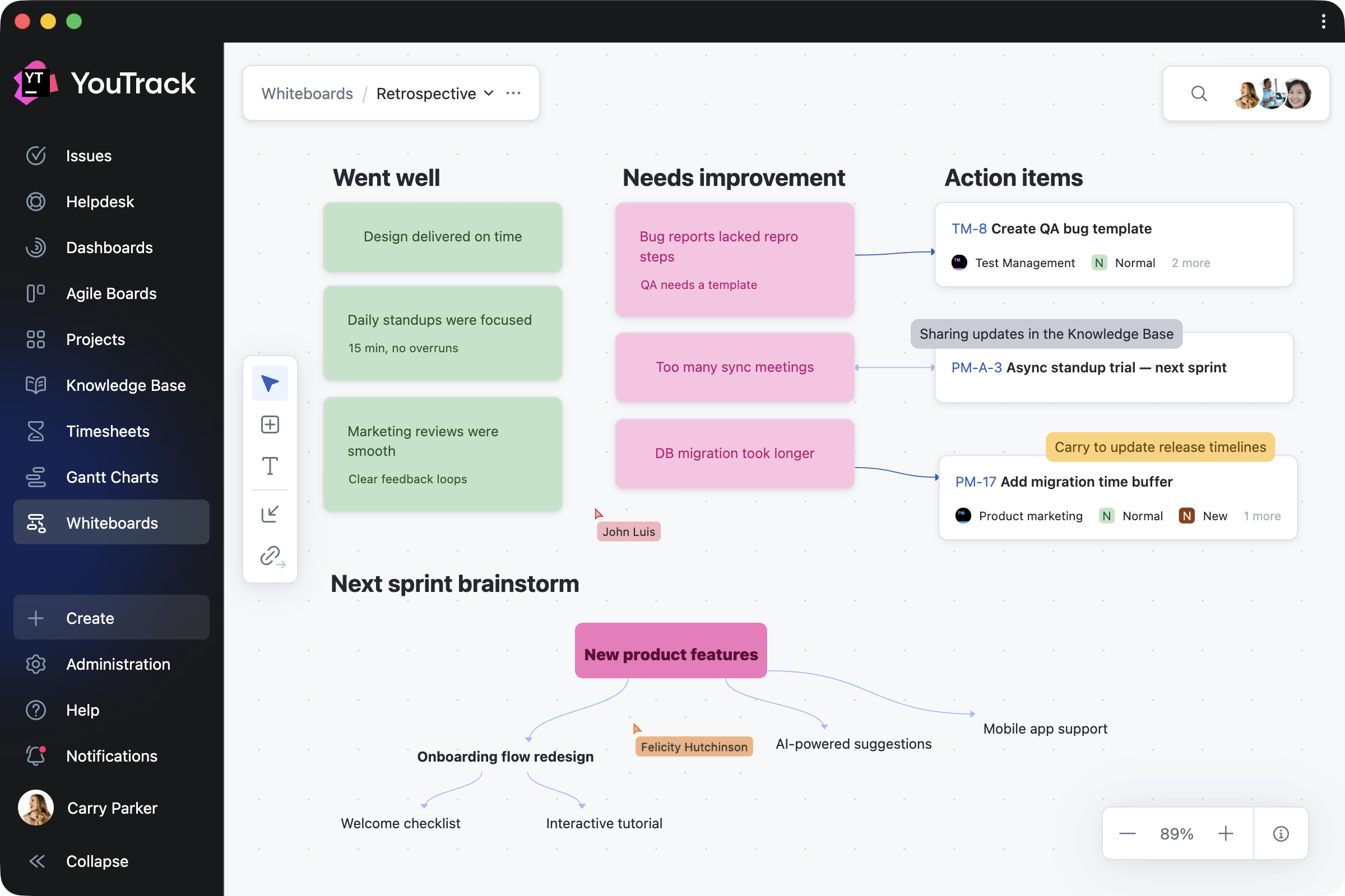 We’re excited to introduce Whiteboards – a new, flexible space where you can visualize your projects as you work on them. Whiteboards extend YouTrack’s built-in functionality and are available to every user and agent.
