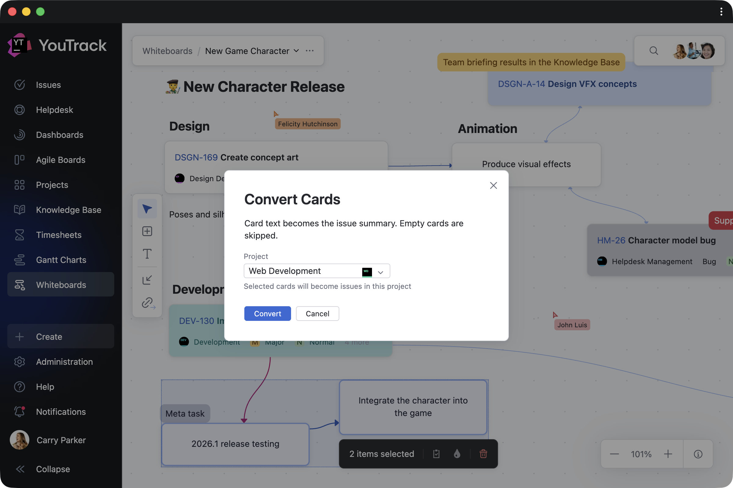 Planning often starts with ideas rather than structured tasks. Project managers can outline team roadmaps, restructure ongoing work, or visualize new projects. As cards are converted into YouTrack tasks and articles, your team can continue working in projects without interruption.
