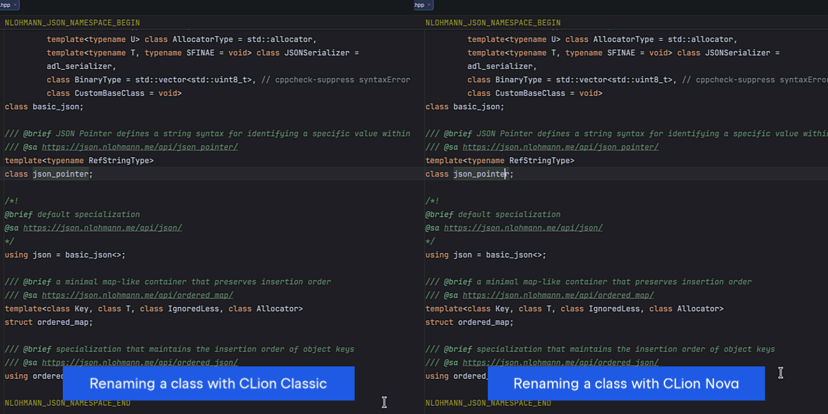 下方视频对比了在大型项目(代码超 10 万行)中使用 CLion Classic 与 CLion Nova 重命名类所需的时间。视频结果显示,这款全新引擎的处理速度可以提升 6 倍以上。