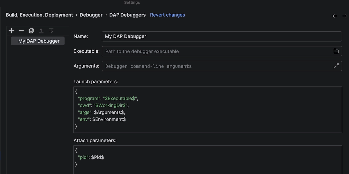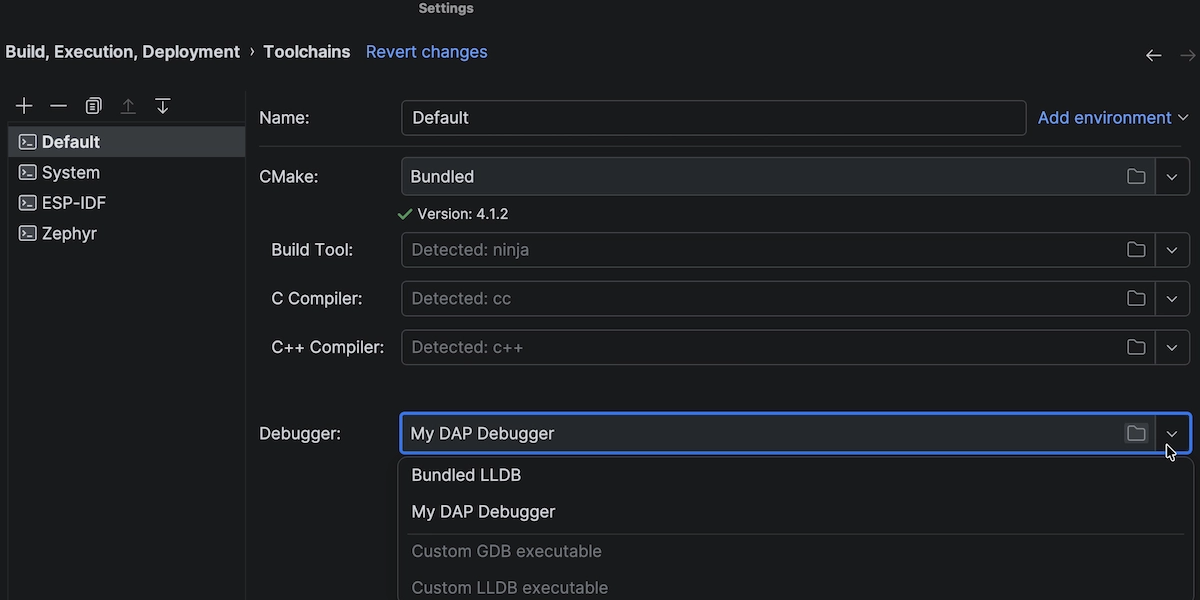 CLion 现在支持调试适配器协议 (DAP),使 IDE 更独立于调试器。借助 DAP 技术,CLion 可以与一系列额外的调试器通信。除了 LLDB 和 GDB,您现在还可以使用支持此协议的第三方实现。