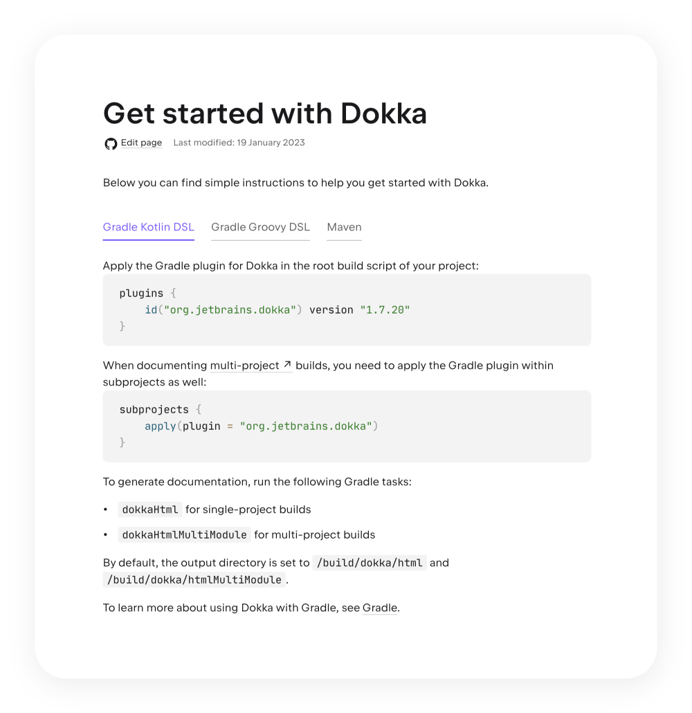 - 使用 HTML 输出稳定 Dokka。