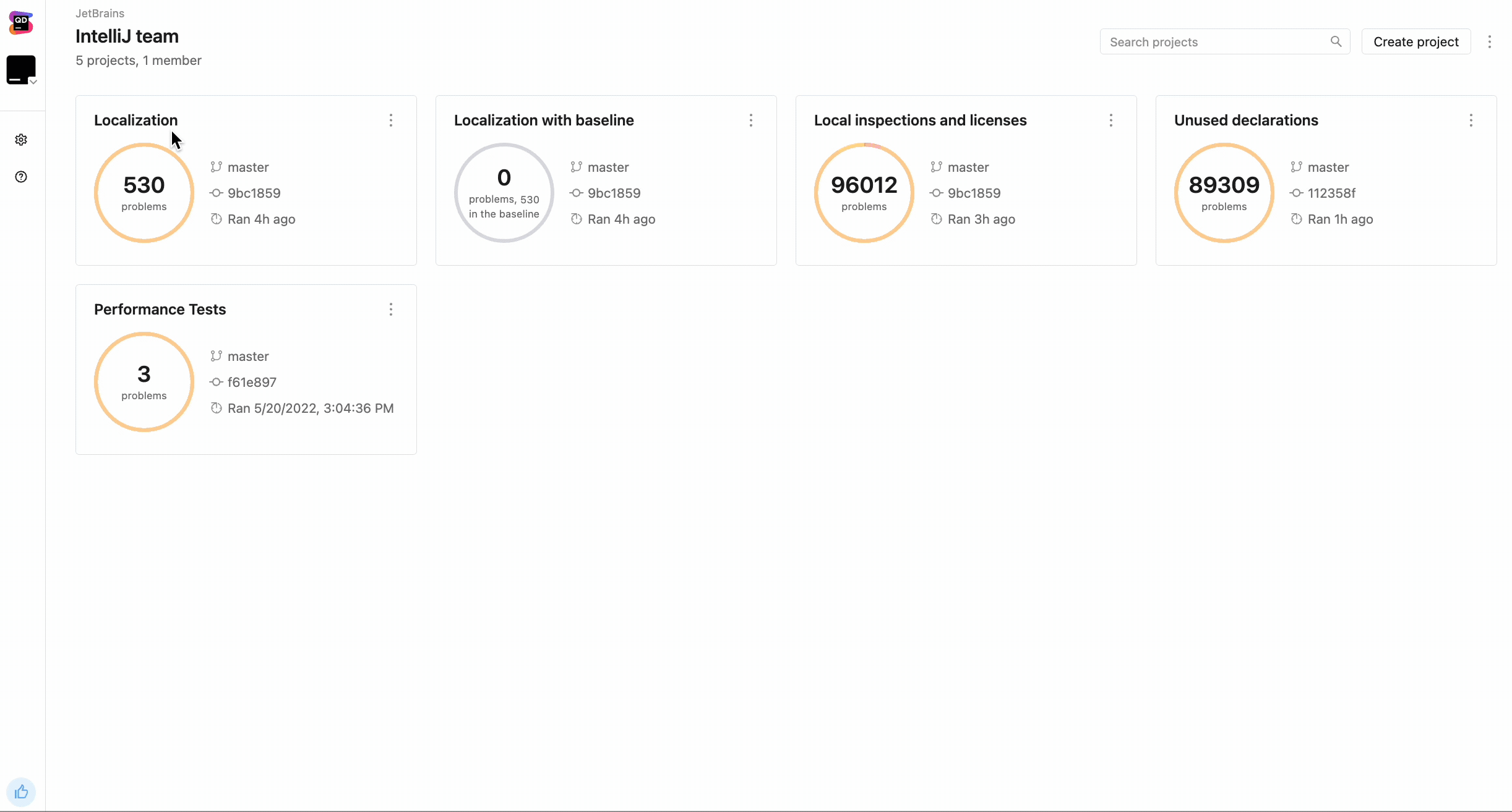 此外,团队还能够在 Qodana Cloud 仪表板中监控进度。仪表板实时更新有关剩余代码问题的信息,并比较不同 Qodana 运行之间的结果。