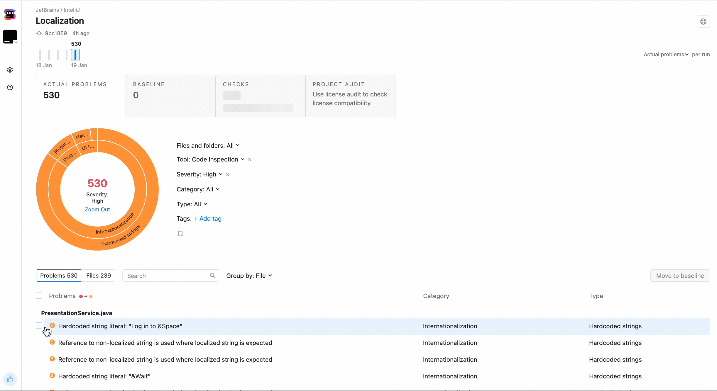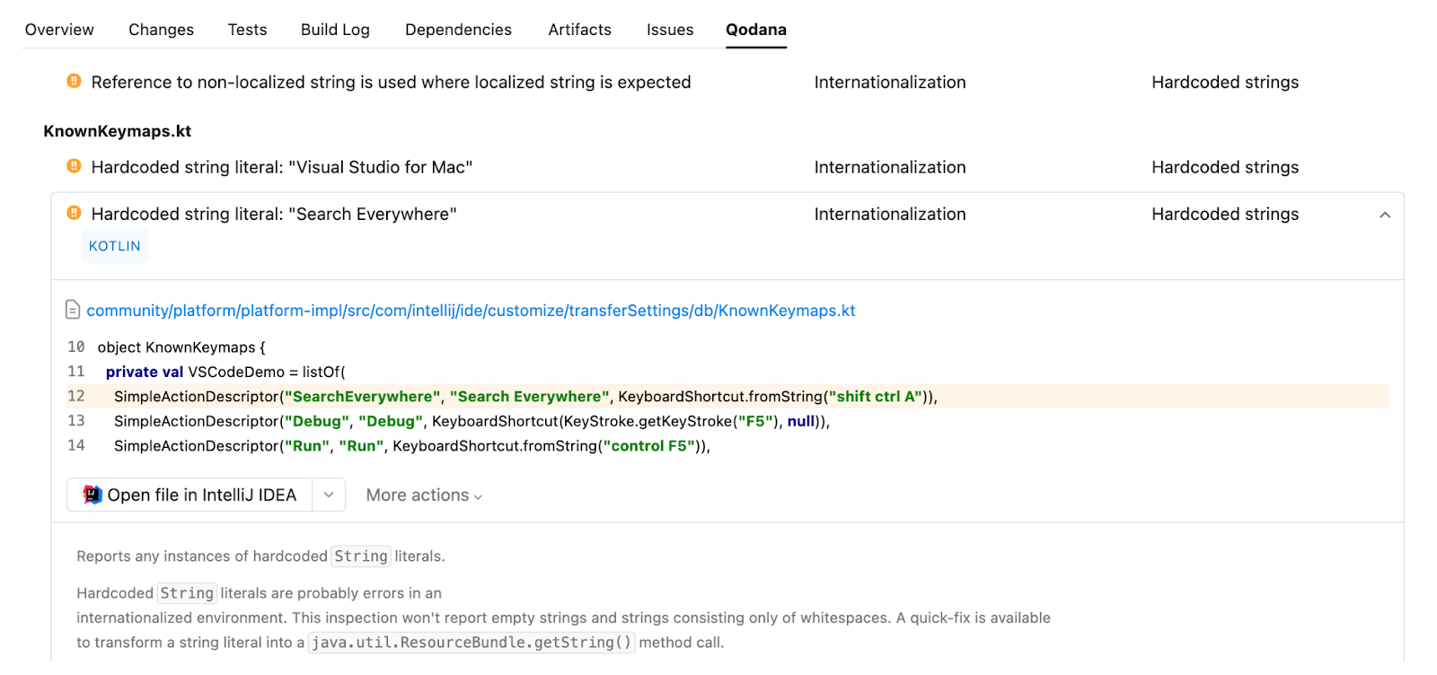 IntelliJ 团队将 Qodana 连接到 TeamCity 管道,并启用国际化代码检查以高亮显示未按要求提取到属性文件中的硬编码字符串文字。