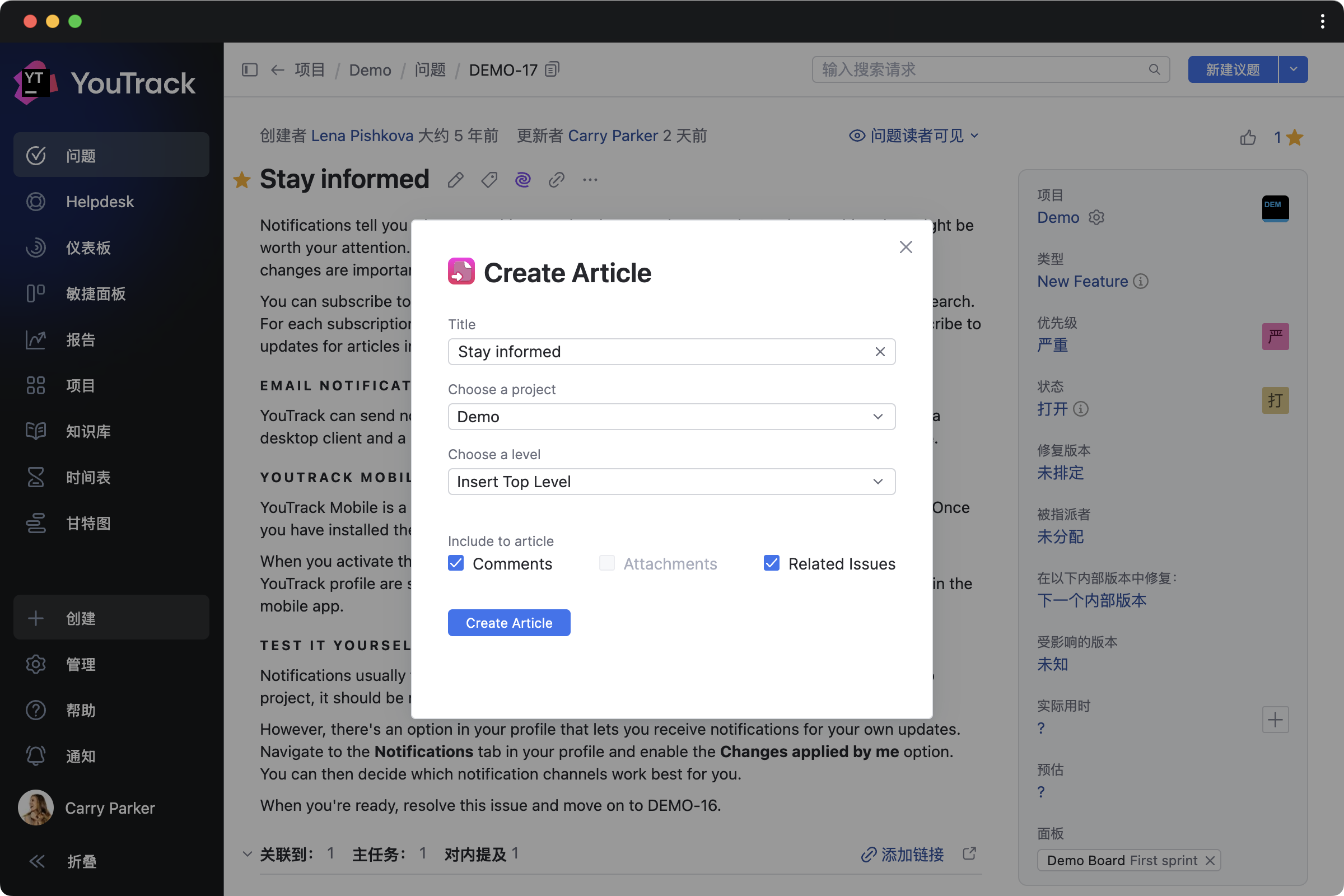我们会倾听大家关于 YouTrack 新设计的反馈,并将持续改进设计。 Notification Center(通知中心)视图现在可以扩展为一个专用页面,从而可以更方便地浏览消息并保持页面整洁,避免受到干扰。