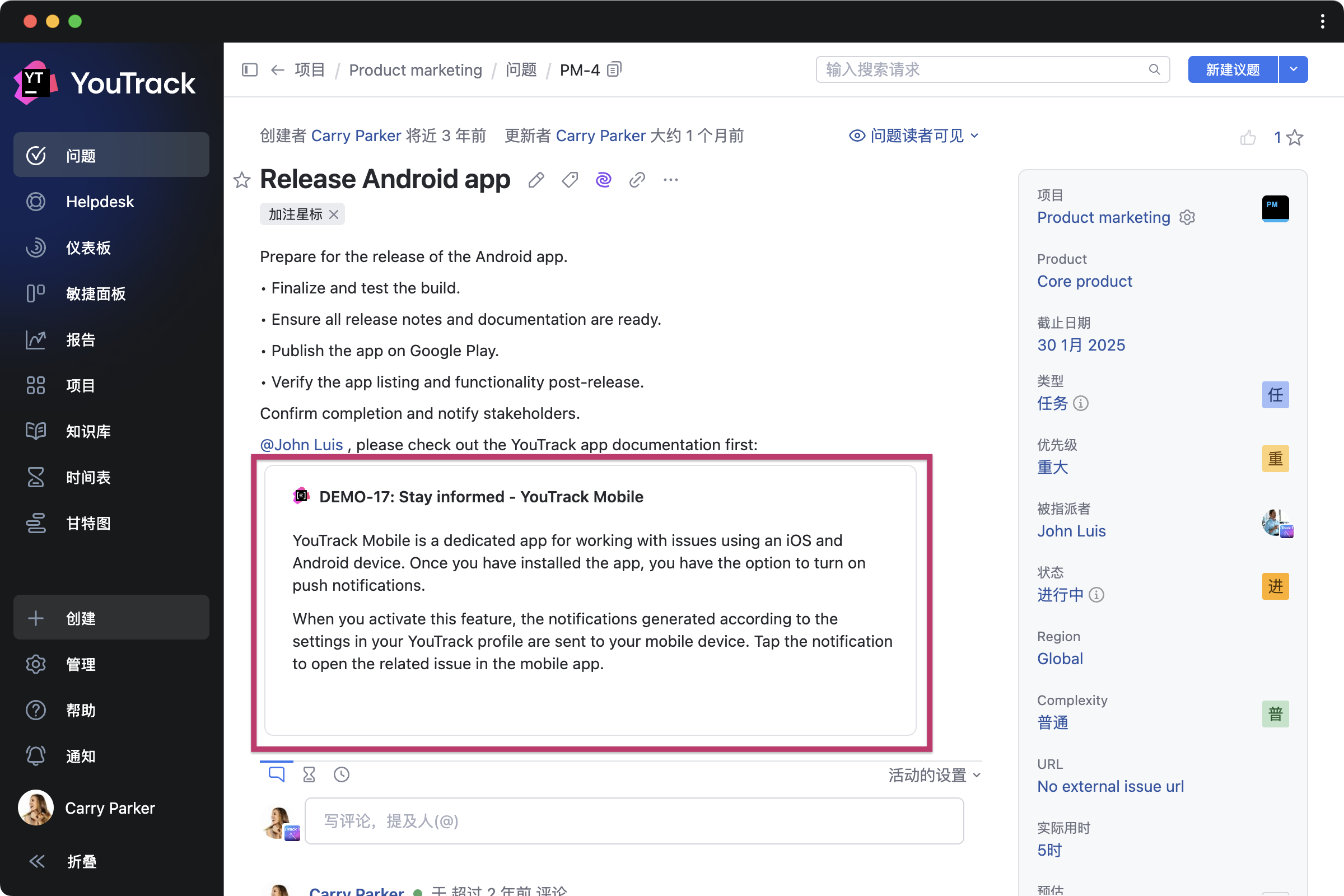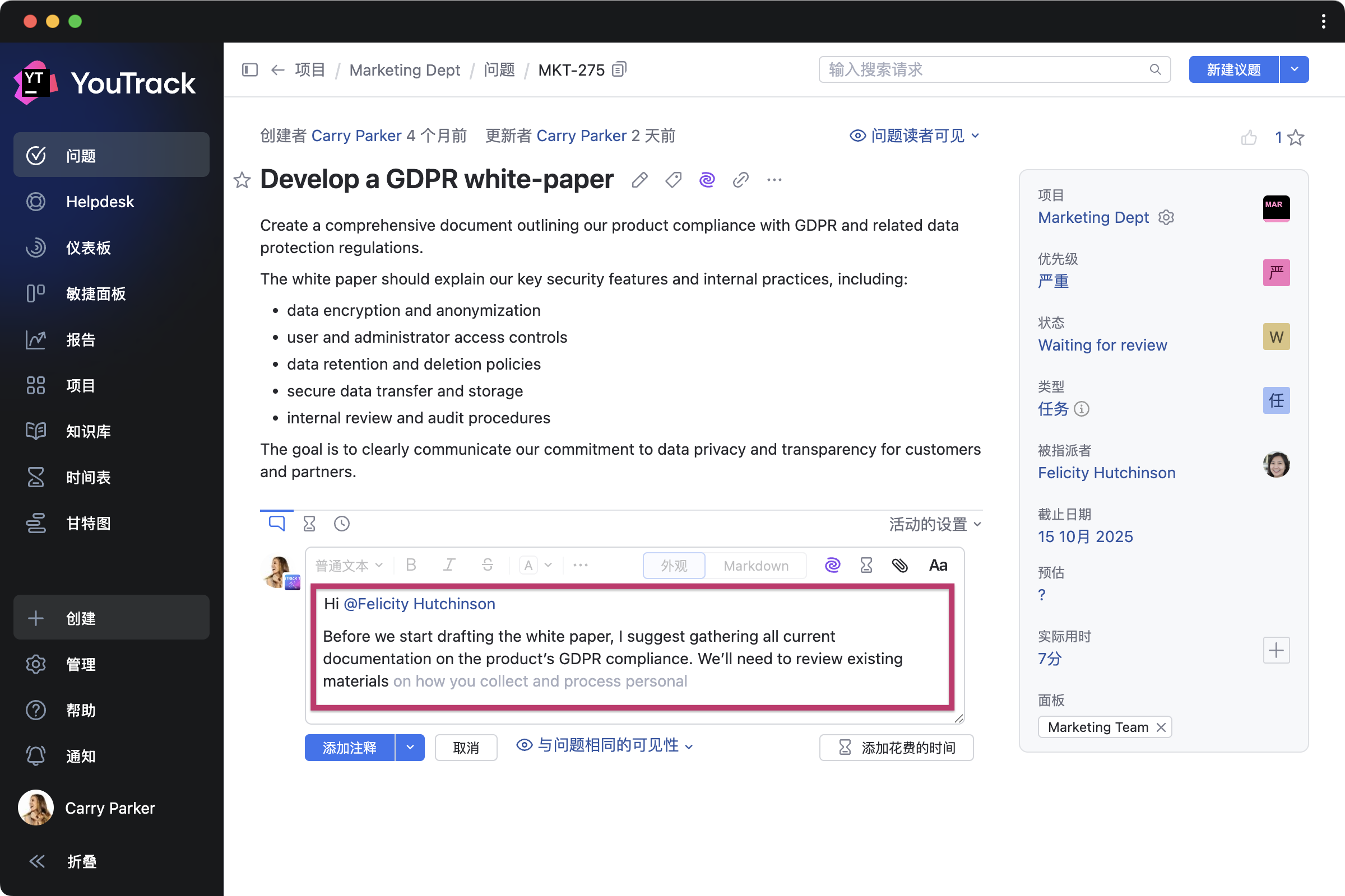 我们持续借助由 JetBrains AI 赋能的服务提升您团队的效率,JetBrains AI 可供您免费使用。 如今,YouTrack 的写作辅助会在您输入时提供词语和短语建议,帮助您更快地撰写任务描述、注释或完整文章。 目前支持英语和德语。 该功能具备上下文感知能力,会根据您的撰写内容调整建议,针对特定任务的深度内容建议也将在近期推出。