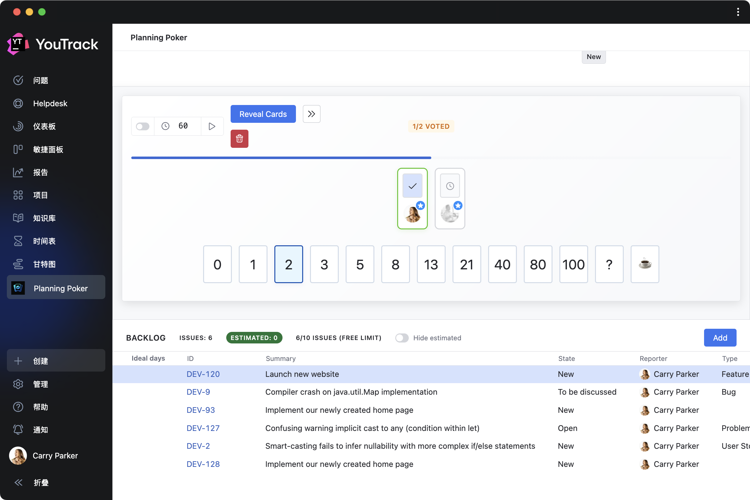 由 Appfero 开发的 Planning Poker Estimation 是一款协作工具,可将敏捷预估会话直接引入 YouTrack。 团队能够创建规划会话,从积压工作中选择任务,通过数字扑克卡片进行匿名投票,同时公布预估,随后将达成共识的值直接保存到任务字段中。