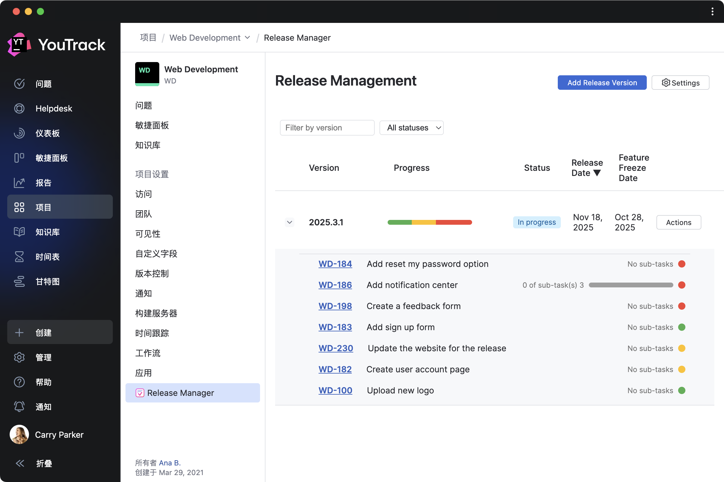 由 Evgenii Venediktov 开发的 Release Manager 可帮助团队更高效地规划、跟踪产品发布,并就发布事宜进行沟通。 该应用添加了用于管理版本和跟踪进度的工具,还能从项目概览页自动生成版本说明,提供了一个查看发布状态、与团队分享动态的集中位置。