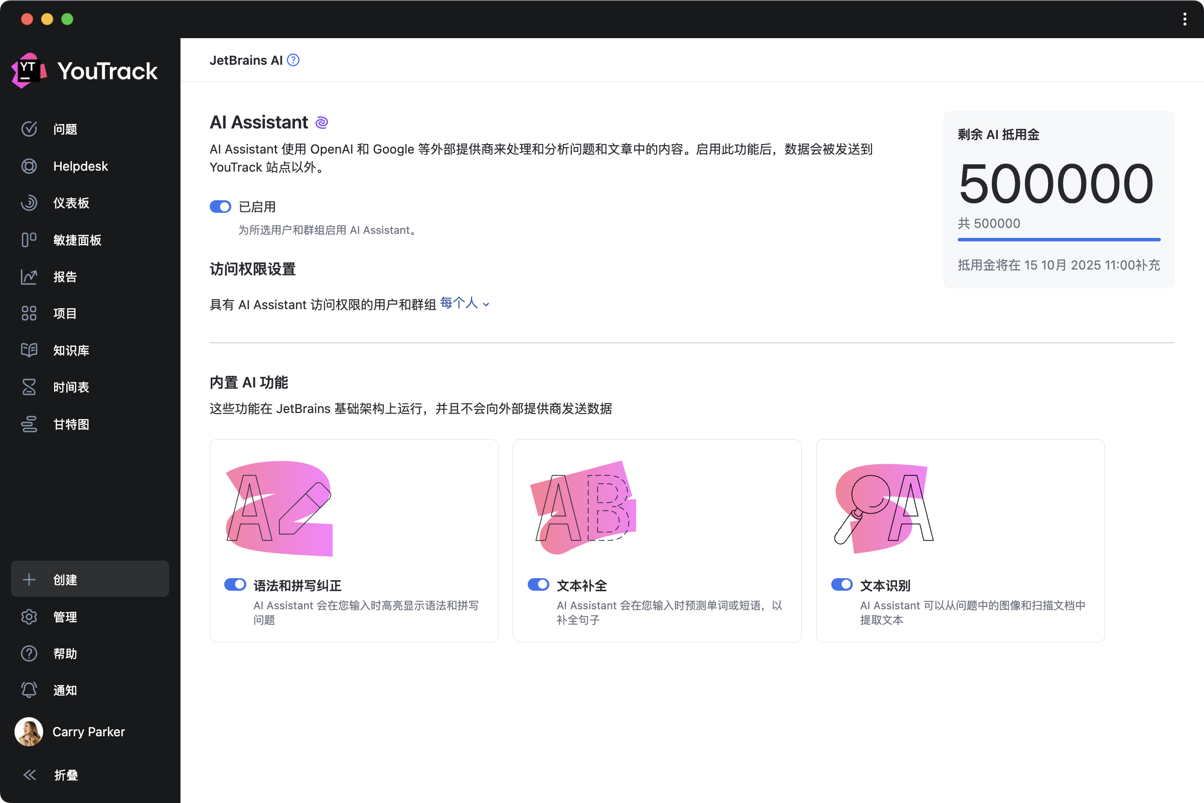 我们已更新 AI Assistant 设置页面,因此管理员能够更好地控制为您的 YouTrack 激活哪些功能。 我们还向分析设置添加了专用标签页,这样,每个用户都可以选择自己要使用的功能。